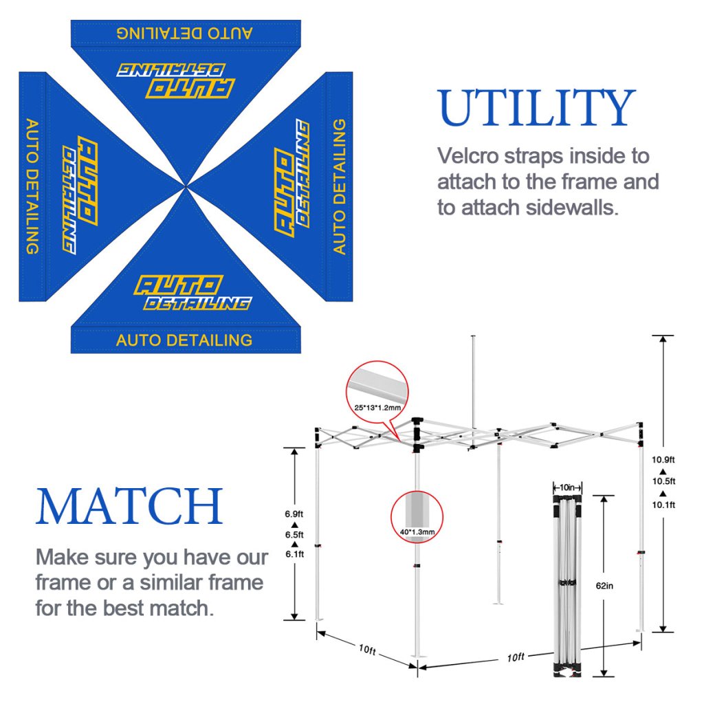 This tent & company is absolutely amazing! I own a Non-Profit & have wanted a tent for events for years but they're always so expensive. I ordered this canopy & put it on an existing 10x10 frame and I couldn't be happier. And the fact that I paid 80% less than anywhere else is mindblowing! I will say, my canopy did arrive with some kind of weird marking on it, like someone accidentally hit it with a sharpie during packaging, but I reached out to the seller & they sent me a brand new ASAP for Free. The quality of this canopy is honestly crazy when I think about the prize I paid, I'm seriously so ecstatic with how amazing and professional it came out and I tell people all the time to order from this company! AND for something that came from overseas and it personalized, it arrived to my door about 2 weeks earlier than the estimate date, which was less than 2 weeks since ordering. 1,000,000% recommend this company to everyone interested in showing off their business at events! Amazing product!!